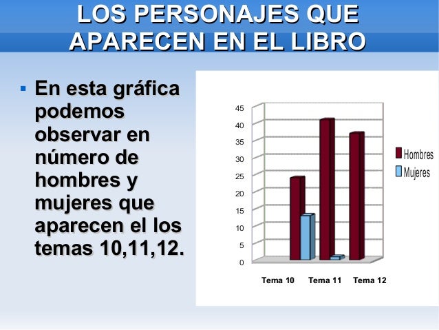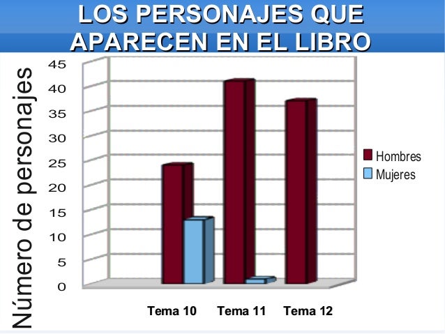 5. 5. LOS PERSONAJES QUELOS PERSONAJES QUEAPARECEN EN EL LIBROAPARECEN EN EL LIBROEn esta gráficaEn esta gráficapodemospodemosobservar enobservar ennúmero denúmero dehombres yhombres ymujeres quemujeres queaparecen el losaparecen el lostemas 10,11,12.temas 10,11,12. 051015202530354045Tema 10 Tema 11 Tema 12Tema 10 Tema 11 Tema 12HombresMujeres