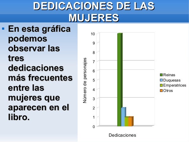 8. 8. DEDICACIONES DE LASDEDICACIONES DE LASMUJERESMUJERESEn esta gráficaEn esta gráficapodemospodemosobservar lasobservar lastrestresdedicacionesdedicacionesmás frecuentesmás frecuentesentre lasentre lasmujeres quemujeres queaparecen en elaparecen en ellibro.libro.012345678910ReinasDuquesasEmperatricesOtrosDedicacionesNúmerodepersonajes