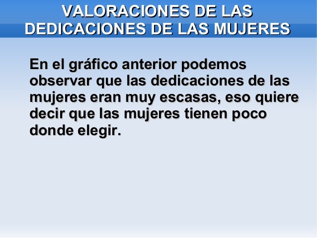 9. 9. VALORACIONES DE LASVALORACIONES DE LASDEDICACIONES DE LAS MUJERESDEDICACIONES DE LAS MUJERESEn el gráfico anterior podemosEn el gráfico anterior podemosobservar que las dedicaciones de lasobservar que las dedicaciones de lasmujeres eran muy escasas, eso quieremujeres eran muy escasas, eso quieredecir que las mujeres tienen pocodecir que las mujeres tienen pocodonde elegir.donde elegir.