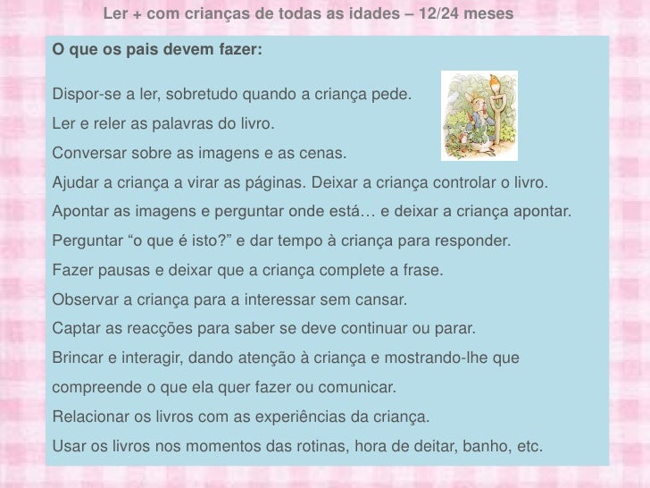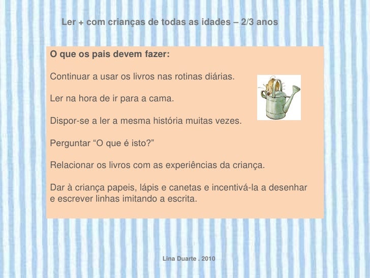 13. 13. Ler + com crianças de todas as idades – 2/3 anosO que os pais devem fazer:Continuar a usar os livros nas rotinas diárias.Ler na hora de ir para a cama.Dispor-se a ler a mesma história muitas vezes.Perguntar “O que é isto?”Relacionar os livros com as experiências da criança.Dar à criança papeis, lápis e canetas e incentivá-la a desenhare escrever linhas imitando a escrita. Lina Duarte . 2010