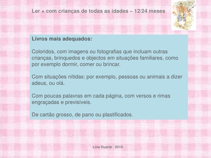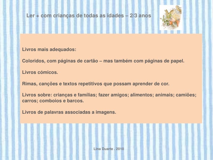 14. 14. Ler + com crianças de todas as idades – 2/3 anosLivros mais adequados:Coloridos, com páginas de cartão – mas também com páginas de papel.Livros cómicos.Rimas, canções e textos repetitivos que possam aprender de cor.Livros sobre: crianças e famílias; fazer amigos; alimentos; animais; camiões;carros; comboios e barcos.Livros de palavras associadas a imagens. Lina Duarte . 2010