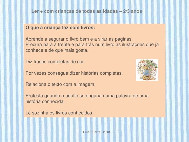 12. 12. Ler + com crianças de todas as idades – 2/3 anosO que a criança faz com livros:Aprende a segurar o livro bem e a virar as páginas.Procura para a frente e para trás num livro as ilustrações que jáconhece e de que mais gosta.Diz frases completas de cor.Por vezes consegue dizer histórias completas.Relaciona o texto com a imagem.Protesta quando o adulto se engana numa palavra de umahistória conhecida.Lê sozinha os livros conhecidos. Lina Duarte . 2010