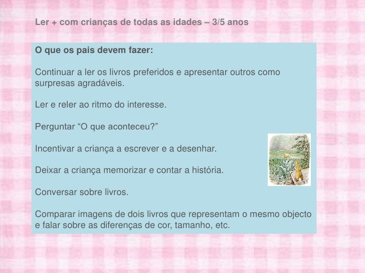 16. 16. Ler + com crianças de todas as idades – 3/5 anosO que os pais devem fazer:Continuar a ler os livros preferidos e apresentar outros comosurpresas agradáveis.Ler e reler ao ritmo do interesse.Perguntar “O que aconteceu?”Incentivar a criança a escrever e a desenhar.Deixar a criança memorizar e contar a história.Conversar sobre livros.Comparar imagens de dois livros que representam o mesmo objectoe falar sobre as diferenças de cor, tamanho, etc.