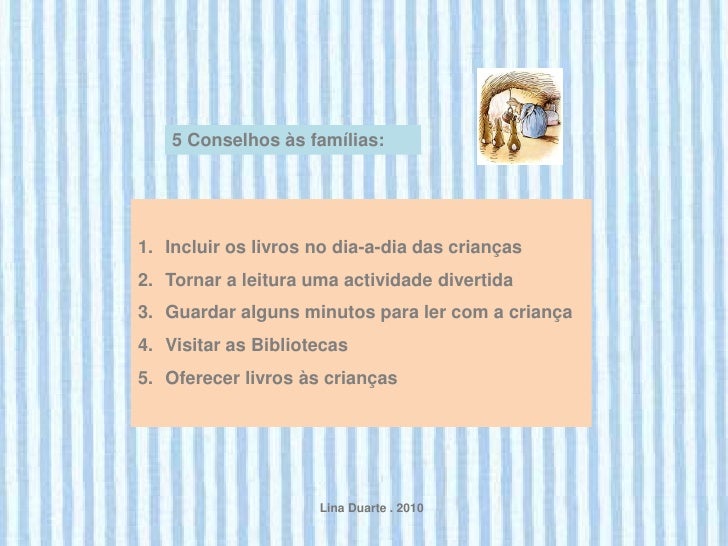 18. 18. 5 Conselhos às famílias:1. Incluir os livros no dia-a-dia das crianças2. Tornar a leitura uma actividade divertida3. Guardar alguns minutos para ler com a criança4. Visitar as Bibliotecas5. Oferecer livros às crianças Lina Duarte . 2010