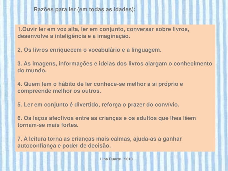 19. 19. Razões para ler (em todas as idades):1.Ouvir ler em voz alta, ler em conjunto, conversar sobre livros,desenvolve a inteligência e a imaginação.2. Os livros enriquecem o vocabulário e a linguagem.3. As imagens, informações e ideias dos livros alargam o conhecimentodo mundo.4. Quem tem o hábito de ler conhece-se melhor a si próprio ecompreende melhor os outros.5. Ler em conjunto é divertido, reforça o prazer do convívio.6. Os laços afectivos entre as crianças e os adultos que lhes lêemtornam-se mais fortes.7. A leitura torna as crianças mais calmas, ajuda-as a ganharautoconfiança e poder de decisão. Lina Duarte . 2010