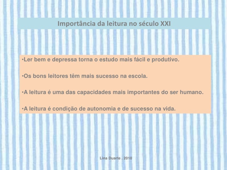 2. 2. Importância da leitura no século XXI•Ler bem e depressa torna o estudo mais fácil e produtivo.•Os bons leitores têm mais sucesso na escola.•A leitura é uma das capacidades mais importantes do ser humano.•A leitura é condição de autonomia e de sucesso na vida. Lina Duarte . 2010