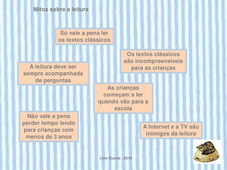 20. 20. Mitos sobre a leitura Só vale a pena ler os textos clássicos Os textos clássicos são incompreensíveis A leitura deve ser para as criançassempre acompanhada de perguntas As crianças começam a ler quando vão para a escola Não vale a penaperder tempo lendo A Internet e a TV sãopara crianças com inimigos da leitura menos de 3 anos Lina Duarte . 2010