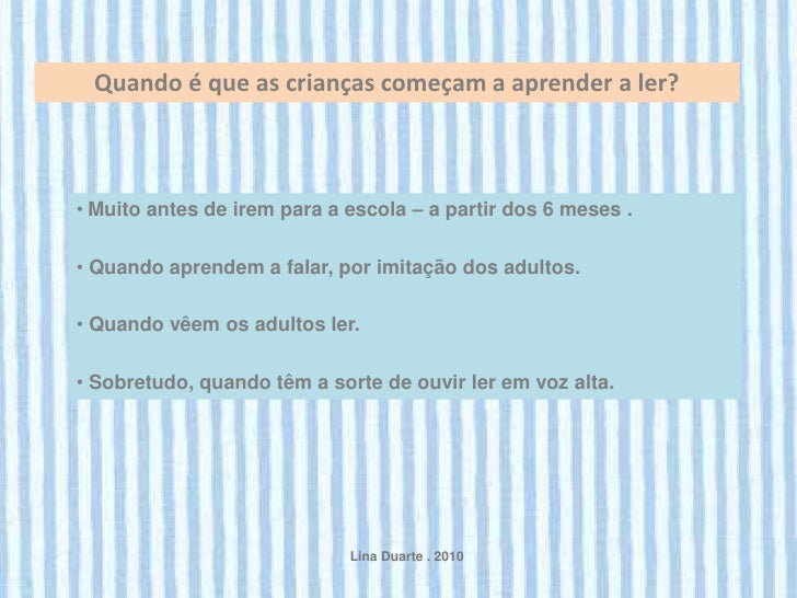 3. 3. Quando é que as crianças começam a aprender a ler?• Muito antes de irem para a escola – a partir dos 6 meses .• Quando aprendem a falar, por imitação dos adultos.• Quando vêem os adultos ler.• Sobretudo, quando têm a sorte de ouvir ler em voz alta. Lina Duarte . 2010