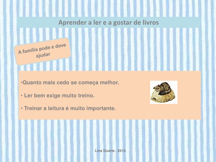 4. 4. Aprender a ler e a gostar de livros•Quanto mais cedo se começa melhor.• Ler bem exige muito treino.• Treinar a leitura é muito importante. Lina Duarte . 2010