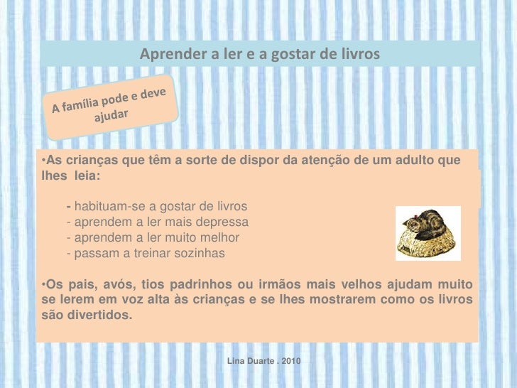 5. 5. Aprender a ler e a gostar de livros•As crianças que têm a sorte de dispor da atenção de um adulto quelhes leia: - habituam-se a gostar de livros - aprendem a ler mais depressa - aprendem a ler muito melhor - passam a treinar sozinhas•Os pais, avós, tios padrinhos ou irmãos mais velhos ajudam muitose lerem em voz alta às crianças e se lhes mostrarem como os livrossão divertidos. Lina Duarte . 2010