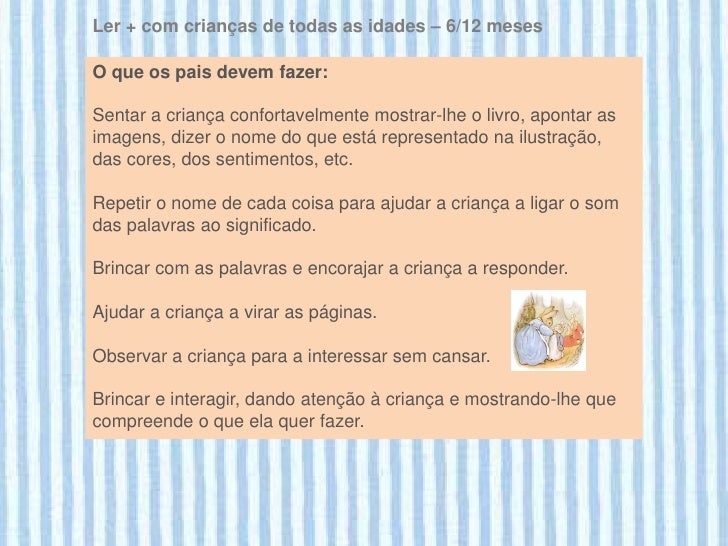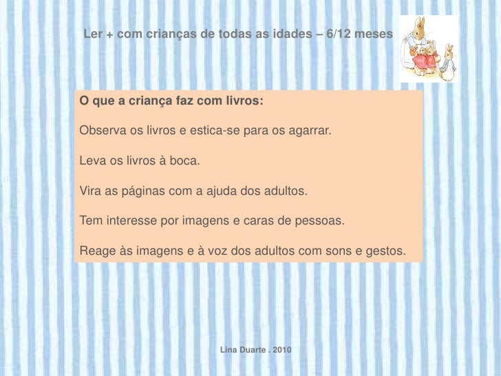 6. 6. Ler + com crianças de todas as idades – 6/12 mesesO que a criança faz com livros:Observa os livros e estica-se para os agarrar.Leva os livros à boca.Vira as páginas com a ajuda dos adultos.Tem interesse por imagens e caras de pessoas.Reage às imagens e à voz dos adultos com sons e gestos. Lina Duarte . 2010