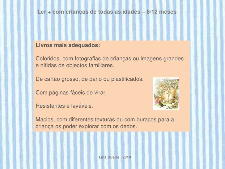 8. 8. Ler + com crianças de todas as idades – 6/12 mesesLivros mais adequados:Coloridos, com fotografias de crianças ou imagens grandese nítidas de objectos familiares.De cartão grosso, de pano ou plastificados.Com páginas fáceis de virar.Resistentes e laváveis.Macios, com diferentes texturas ou com buracos para acriança os poder explorar com os dedos. Lina Duarte . 2010