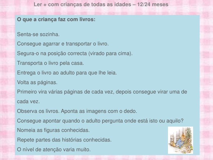 9. 9. Ler + com crianças de todas as idades – 12/24 meses Ler + com crianças de todas as idades – 6/12 mesesO que a criança faz com livros:Senta-se sozinha.Consegue agarrar e transportar olivros: O que a criança faz com livro.Segura-o na posição correcta (viradopara os agarrar. Observa os livros e estica-se para cima).Transporta o livro pela casa. Leva os livros à boca.Entrega o livro ao adulto para que lhe leia. Vira as páginas com a ajuda dos adultos.Volta as páginas.Primeiro vira várias páginas de cada carasdepois consegue virar uma de Tem interesse por imagens e vez, de pessoas.cada vez. Reage às imagens e à voz dos adultos com sons e gestos.Observa os livros. Aponta as imagens com o dedo.Consegue apontar quando o adulto pergunta onde está isto ou aquilo?Nomeia as figuras conhecidas.Repete partes das histórias conhecidas.O nível de atenção varia muito.