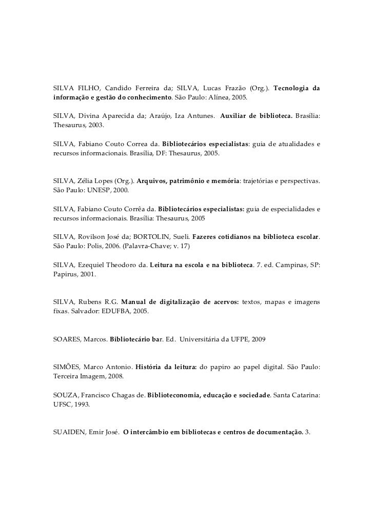 11. 11. SILVA  FILHO,  Candido  Ferreira  da;  SILVA,  Lucas  Frazão  (Org.).  Tecnologia  da informação e gestão do conhecimento. São Paulo: Alínea, 2005.  SILVA,  Divina  Aparecida  da;  Araújo,  Iza  Antunes.   Auxiliar  de  biblioteca.  Brasília: Thesaurus, 2003.  SILVA,  Fabiano  Couto  Correa  da.  Bibliotecários  especialistas:  guia  de  atualidades  e recursos informacionais. Brasília, DF: Thesaurus, 2005.   SILVA, Zélia Lopes (Org.). Arquivos, patrimônio e memória: trajetórias e perspectivas. São Paulo: UNESP, 2000.  SILVA, Fabiano Couto Corrêa da. Bibliotecários especialistas: guia de especialidades e recursos informacionais. Brasília: Thesaurus, 2005  SILVA, Rovilson José da; BORTOLIN, Sueli. Fazeres cotidianos na biblioteca escolar. São Paulo: Polis, 2006. (Palavra‐Chave; v. 17)  SILVA, Ezequiel Theodoro da. Leitura na escola e na biblioteca. 7. ed. Campinas, SP: Papirus, 2001.   SILVA,  Rubens  R.G.  Manual  de  digitalização  de  acervos:  textos,  mapas  e  imagens fixas. Salvador: EDUFBA, 2005.    SOARES, Marcos. Bibliotecário bar. Ed.  Universitária da UFPE, 2009   SIMÕES,  Marco  Antonio.  História  da  leitura:  do  papiro  ao  papel  digital.  São  Paulo: Terceira Imagem, 2008.  SOUZA, Francisco Chagas de. Biblioteconomia, educação e sociedade. Santa Catarina: UFSC, 1993.   SUAIDEN, Emir José.  O intercâmbio em bibliotecas e centros de documentação. 3.
