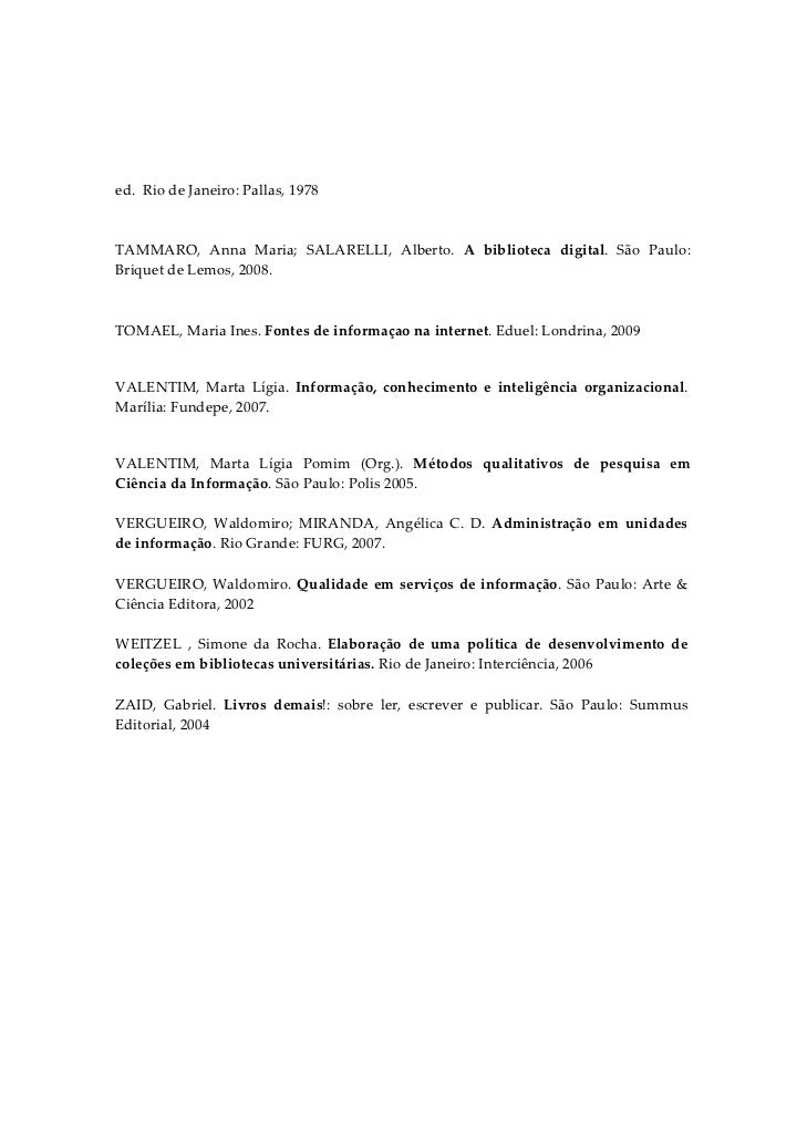 12. 12. ed.  Rio de Janeiro: Pallas, 1978   TAMMARO,  Anna  Maria;  SALARELLI,  Alberto.  A  biblioteca  digital.  São  Paulo: Briquet de Lemos, 2008.   TOMAEL, Maria Ines. Fontes de informaçao na internet. Eduel: Londrina, 2009  VALENTIM,  Marta  Lígia.  Informação,  conhecimento  e  inteligência  organizacional. Marília: Fundepe, 2007.  VALENTIM,  Marta  Lígia  Pomim  (Org.).  Métodos  qualitativos  de  pesquisa  em Ciência da Informação. São Paulo: Polis 2005.  VERGUEIRO,  Waldomiro;  MIRANDA,  Angélica  C.  D.  Administração  em  unidades de informação. Rio Grande: FURG, 2007.  VERGUEIRO, Waldomiro. Qualidade em serviços de informação. São Paulo: Arte & Ciência Editora, 2002  WEITZEL  ,  Simone  da  Rocha.  Elaboração  de  uma  política  de  desenvolvimento  de coleções em bibliotecas universitárias. Rio de Janeiro: Interciência, 2006  ZAID,  Gabriel.  Livros  demais!:  sobre  ler,  escrever  e  publicar.  São  Paulo:  Summus Editorial, 2004