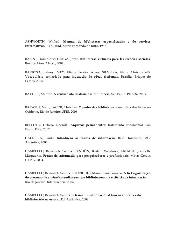 2. 2. ASHWORTH,  Wilfred.  Manual  de  bibliotecas  especializadas  e  de  serviços informativos. 3. ed. Trad. Maria Fernanda de Brito, 1967   BABINI,  Dominique;  FRAGA,  Jorge.  Bibliotecas  virtuales  para  las  ciencias  sociales. Buenos Aires: Clacso, 2004.   BARBOSA,  Sidney;  MEY,  Eliane  Serrão   Alves;  SILVEIRA,  Naira  Christofoletti. Vocabulário  controlado  para  indexação  de  obras  ficcionais.  Brasília,  Briquet  de Lemos, 2005.   BATTLES, Mattew. A conturbada  história das bibliotecas. São Paulo: Planeta, 2003.   BARATIN, Marc;  JACOB, Christian. O poder das bibliotecas: a memória dos livros no Ocidente. Rio de Janeiro: UFRJ, 2006   BELLOTO,  Heloisa  Liberalli.  Arquivos  permanentes:  tratamento  documental.  São Paulo: FGV, 2007.  CALDEIRA,  Paulo.  Introdução  as  fontes  de  informação.  Belo  Horizonte,  MG: Autêntica, 2005.  CAMPELLO,  Bernadete  Santos;  CENDÓN,  Beatriz  Valadares;  KREMEK,  Jeannette Marguerite. Fontes de informação para pesquisadores e profissionais. Minas Gerais: UFMG, 2004.   CAMPELLO, Bernadete Santos; RODRIGUES, Mara Eliane Fonseca. A (re) significação do processo de ensino/aprendizagem em biblioteconomia e ciência da informação. Rio de Janeiro: Internciência, 2004   CAMPELLO, Bernadete Santos. Letramento informacional função educativa do bibliotecário na escola . Ed. Autêntica, 2008