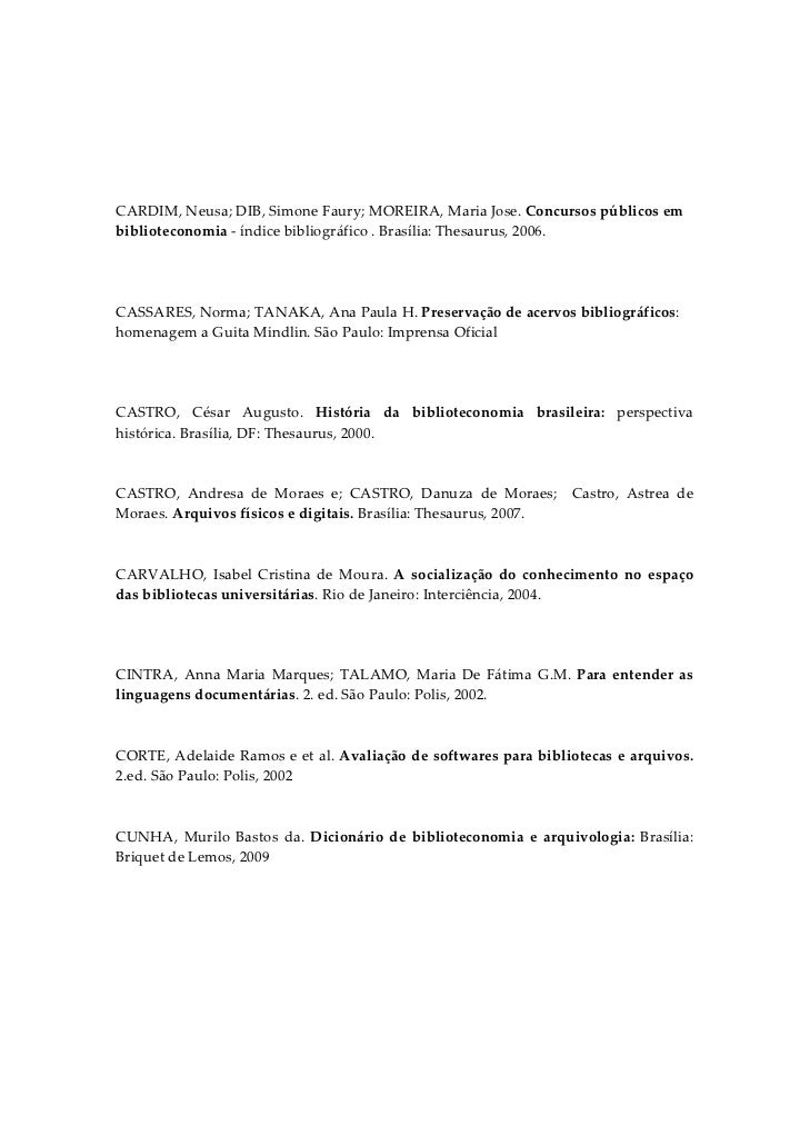 3. 3.  CARDIM, Neusa; DIB, Simone Faury; MOREIRA, Maria Jose. Concursos públicos em biblioteconomia ‐ índice bibliográfico . Brasília: Thesaurus, 2006.     CASSARES, Norma; TANAKA, Ana Paula H. Preservação de acervos bibliográficos:  homenagem a Guita Mindlin. São Paulo: Imprensa Oficial    CASTRO,  César  Augusto.  História  da  biblioteconomia  brasileira:  perspectiva histórica. Brasília, DF: Thesaurus, 2000.   CASTRO,  Andresa  de  Moraes  e;  CASTRO,  Danuza  de  Moraes;    Castro,  Astrea  de Moraes. Arquivos físicos e digitais. Brasília: Thesaurus, 2007.   CARVALHO,  Isabel  Cristina  de  Moura.  A  socialização  do  conhecimento  no  espaço das bibliotecas universitárias. Rio de Janeiro: Interciência, 2004.    CINTRA,  Anna  Maria  Marques;  TALAMO,  Maria  De  Fátima  G.M.  Para  entender  as linguagens documentárias. 2. ed. São Paulo: Polis, 2002.   CORTE, Adelaide Ramos e et al. Avaliação de softwares para bibliotecas e arquivos. 2.ed. São Paulo: Polis, 2002   CUNHA,  Murilo  Bastos  da.  Dicionário  de  biblioteconomia  e  arquivologia:  Brasília: Briquet de Lemos, 2009
