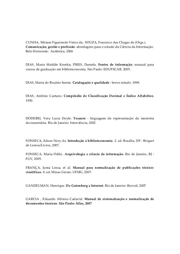 4. 4. CUNHA, Miriam Figueiredo Vieira da;  SOUZA, Francisco das Chagas de (Orgs.). Comunicação, gestão e profissão: abordagens para o estudo da Ciência da Informação. Belo Horizonte:  Autêntica, 2006   DIAS,  Maria  Matilde  Kronka;  PIRES,  Daniela.  Fontes  de  informação:  manual  para cursos de graduação em biblioteconomia. São Paulo: EDUFSCAR, 2005.   DIAS, Maria do Rosário Imene. Catalogação e qualidade : breve estudo. 1999.       DIAS,  Antônio  Caetano.  Compêndio  de  Classificação  Decimal  e  Índice  Alfabético. 1950.     DODEBEI,  Vera  Lucia  Doyle.  Tesauro  ‐  linguagem  de  representação  da  memória documentária. Rio de Janeiro: Interciência, 2002    FONSECA, Edson Nery da. Introdução à biblioteconomia. 2. ed. Brasília, DF : Briquet de Lemos/Livros, 2007.  FONSECA,  Maria  Odila .  Arquivologia  e  ciência  da  informação.  Rio  de  Janeiro,  RJ  : FGV, 2005.     FRANÇA,  Junia  Lessa,  et  al.  Manual  para  normalização  de  publicações  técnico‐científicas. 8. ed. Minas Gerais: UFMG, 2007.   GANDELMAN, Henrique. De Gutenberg a Internet. Rio de Janeiro: Record, 2007   GARCIA  ,  Eduardo  Alfonso  Cadavid.  Manual  de  sistematização  e  normalização  de documentos técnicos. São Paulo: Atlas, 2007