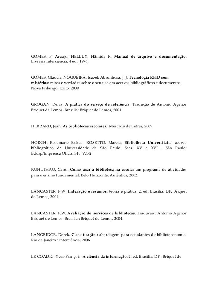 5. 5.  GOMES,  F.  Araujo;  HELLUY,  Hâmida  R.  Manual  de  arquivo  e  documentação. Livraria Interciência. 4 ed., 1976.   GOMES, Gláucia; NOGUEIRA, Isabel; Abrunhosa, J. J. Tecnologia RFID sem mistérios: mitos e verdades sobre o seu uso em acervos bibliográficos e documentos. Nova Friburgo: Exito, 2009   GROGAN,  Denis.  A  prática  do  serviço  de  referência.  Tradução  de  Antonio  Agenor Briquet de Lemos. Brasília: Briquet de Lemos, 2001.   HEBRARD, Jean. As bibliotecas escolares.  Mercado de Letras, 2009   HORCH,  Rosemarie  Erika,    ROSETTO,  Marcia.  Bibliotheca  Universitatis:  acervo bibliográfico  da  Universidade  de  São  Paulo.  Sécs.  XV  e  XVI  .  São  Paulo: Edusp/Imprensa Oficial SP,  V.1‐2   KUHLTHAU,  Carol.  Como  usar  a  biblioteca  na  escola:  um  programa  de  atividades para o ensino fundamental. Belo Horizonte: Autêntica, 2002.   LANCASTER, F.W. Indexação e resumos: teoria e prática.  2. ed. Brasília, DF: Briquet de Lemos, 2004..   LANCASTER, F.W. Avaliação de  serviços de bibliotecas. Tradução : Antonio Agenor Briquet de Lemos. Brasília : Briquet de Lemos, 2004.   LANGRIDGE,  Derek.  Classificação  :  abordagem  para  estudantes  de  biblioteconomia. Rio de Janeiro : Interciência, 2006    LE COADIC, Yves‐François. A ciência da informação. 2. ed. Brasília, DF : Briquet de