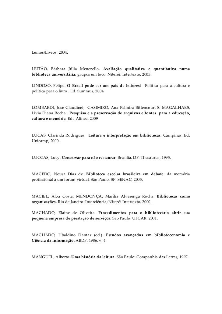 6. 6. Lemos/Livros, 2004.   LEITÃO,  Bárbara  Júlia  Menezello.  Avaliação  qualitativa  e  quantitativa  numa biblioteca universitária: grupos em foco. Niterói: Intertexto, 2005.  LINDOSO,  Felipe.  O  Brasil  pode  ser  um  pais  de  leitores?    Política  para  a  cultura  e política para o livro . Ed. Summus, 2004   LOMBARDI,  Jose  Claudinei;    CASIMIRO,  Ana  Palmira  Bittencourt  S.  MAGALHAES, Livia Diana Rocha.  Pesquisa e a preservação de arquivos e fontes  para a educação, cultura e memória. Ed.  Alínea, 2009   LUCAS,  Clarinda  Rodrigues.    Leitura  e  interpretação  em  bibliotecas.  Campinas:  Ed. Unicamp, 2000.    LUCCAS, Lucy. Conservar para não restaurar. Brasília, DF: Thesaurus, 1995.   MACEDO,  Neusa  Dias  de.  Biblioteca  escolar  brasileira  em  debate:  da  memória profissional a um fórum virtual. São Paulo, SP: SENAC, 2005.     MACIEL,  Alba  Costa;  MENDONÇA,  Marília  Alvarenga  Rocha.  Bibliotecas  como organizações. Rio de Janeiro: Interciência; Niterói Intertexto, 2000.  MACHADO,  Elaine  de  Oliveira.  Procedimentos  para  o  bibliotecário  abrir  sua pequena empresa de prestação de serviços. São Paulo: UFCAR. 2001.   MACHADO,  Ubaldino  Dantas  (ed.).  Estudos  avançados  em  biblioteconomia  e Ciência da informação. ABDF, 1986. v. 4   MANGUEL, Alberto. Uma história da leitura. São Paulo: Companhia das Letras, 1997.