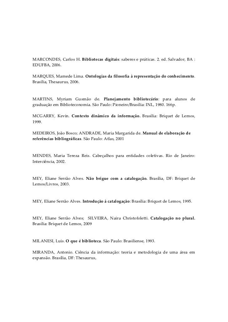 7. 7.  MARCONDES, Carlos H. Bibliotecas digitais: saberes e práticas. 2. ed. Salvador, BA : EDUFBA, 2006.  MARQUES, Mamede Lima. Ontologias da filosofia à representação do conhecimento. Brasília, Thesaurus, 2006.   MARTINS,  Myriam  Gusmão  de.  Planejamento  bibliotecário:  para  alunos  de graduação em Biblioteconomia. São Paulo: Pioneiro/Brasília: INL, 1980. 166p.  MCGARRY,  Kevin.  Contexto  dinâmico  da  informação.  Brasília:  Briquet  de  Lemos, 1999.  MEDEIROS, João Bosco; ANDRADE, Maria Margarida de. Manual de elaboração de referências bibliográficas. São Paulo: Atlas, 2001    MENDES,  Maria  Tereza  Reis.  Cabeçalhos  para  entidades  coletivas.  Rio  de  Janeiro: Interciência, 2002.   MEY,  Eliane  Serrão  Alves.  Não  brigue  com  a  catalogação.  Brasília,  DF:  Briquet  de Lemos/Livros, 2003.   MEY, Eliane Serrão Alves. Introdução à catalogação: Brasília: Briquet de Lemos, 1995.   MEY,  Eliane  Serrão  Alves;    SILVEIRA,  Naira  Christofoletti.  Catalogação  no  plural. Brasília: Briquet de Lemos, 2009   MILANESI, Luis. O que é biblioteca. São Paulo: Brasiliense, 1993.  MIRANDA,  Antonio.  Ciência  da  informação:  teoria  e  metodologia  de  uma  área  em expansão. Brasília, DF: Thesaurus,