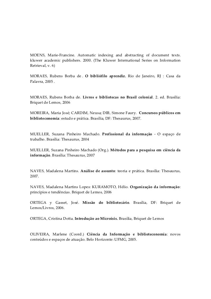 8. 8.  MOENS,  Marie‐Francine.  Automatic  indexing  and  abstracting  of  document  texts.  kluwer  academic  publishers.  2000.  (The  Kluwer  International  Series  on  Information Retrieval, v. 6)  MORAES,  Rubens  Borba  de .  O  bibliófilo  aprendiz.  Rio  de  Janeiro,  RJ  :  Casa  da Palavra, 2005 .   MORAES,  Rubens  Borba  de.  Livros  e  bibliotecas  no  Brasil  colonial.  2.  ed.  Brasília: Briquet de Lemos, 2006  MOREIRA, Maria José; CARDIM, Neusa; DIB, Simone Faury.  Concursos públicos em biblioteconomia: estudo e prática. Brasília, DF: Thesaurus, 2007.   MUELLER,  Suzana  Pinheiro  Machado.  Profissional  da  informação  ‐  O  espaço  de trabalho. Brasília: Thesaurus, 2004  MUELLER, Suzana Pinheiro Machado (Org.). Métodos para a pesquisa em ciência da informação. Brasília: Thesaurus, 2007   NAVES,  Madalena  Martins.  Análise  de  assunto:  teoria  e  prática.  Brasília:  Thesaurus, 2007.  NAVES,  Madalena  Martins  Lopes:  KURAMOTO,  Hélio.  Organização  da  informação: princípios e tendências. Briquet de Lemos, 2006  ORTEGA  y  Gasset,  José.  Missão  do  bibliotecário.  Brasília,  DF:  Briquet  de Lemos/Livros, 2006.  ORTEGA, Cristina Dotta. Introdução ao Microisis. Brasília, Briquet de Lemos   OLIVEIRA,  Marlene  (Coord.)  Ciência  da  Informação  e  biblioteconomia:  novos conteúdos e espaços de atuação. Belo Horizonte: UFMG, 2005.