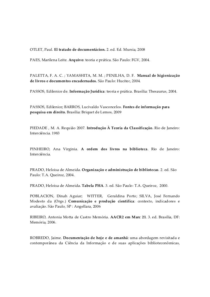 9. 9. OTLET, Paul. El tratado de documentácion. 2. ed. Ed. Mursia, 2008  PAES, Marilena Leite. Arquivo: teoria e prática. São Paulo: FGV, 2004.    PALETTA, F. A. C. ; YAMASHITA, M. M. ; PENILHA, D. F.  Manual de higienização de livros e documentos encadernados. São Paulo: Hucitec, 2004.  PASSOS, Edilenice de. Informação Jurídica: teoria e prática. Brasília: Thesaurus, 2004.   PASSOS, Edilenice; BARROS, Lucivaldo Vasconcelos. Fontes de informação para pesquisa em direito. Brasília: Briquet de Lemos, 2009   PIEDADE , M. A. Requião 2007. Introdução À Teoria da Classificação. Rio de Janeiro: Interciência. 1983   PINHEIRO,  Ana  Virginia.  A  ordem  dos  livros  na  biblioteca.  Rio  de  Janeiro: Interciência.   PRADO, Heloisa de Almeida. Organização e administração de bibliotecas. 2. ed. São Paulo: T.A. Queiroz, 2004.  PRADO, Heloisa de Almeida. Tabela PHA. 3. ed. São Paulo: T.A. Queiroz,  2000.  POBLACION,  Dinah  Aguiar;    WITTER,    Geraldina  Porto;  SILVA,  José  Fernando Modesto  da  (Orgs.)  Comunicação  e  produção  científica:  contexto,  indicadores  e avaliação. São Paulo, SP : Angellara, 2006    RIBEIRO, Antonia Motta de Castro Memória. AACR2 em Marc 21. 3. ed. Brasília, DF: Memória, 2006.   ROBREDO, Jaime. Documentação de hoje e de amanhã: uma abordagem revisitada e contemporânea  da  Ciência  da  Informação  e  de  suas  aplicações  biblioteconômicas,
