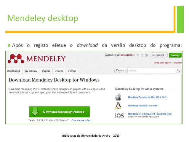 11. 11. Bibliotecas da Universidade de Aveiro | 2013 Mendeley desktop  Após o registo efetue o download da versão desktop do programa:
