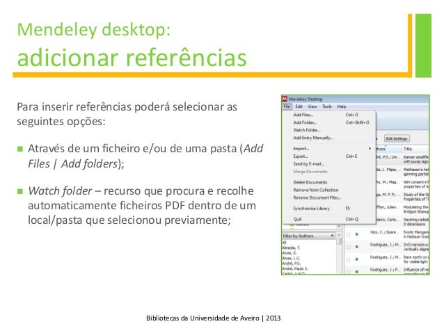 13. 13. Bibliotecas da Universidade de Aveiro | 2013 Mendeley desktop: adicionar referências Para inserir referências poderá selecionar as seguintes opções:  Através de um ficheiro e/ou de uma pasta (Add Files | Add folders);  Watch folder – recurso que procura e recolhe automaticamente ficheiros PDF dentro de um local/pasta que selecionou previamente;