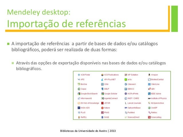 15. 15. Bibliotecas da Universidade de Aveiro | 2013 Mendeley desktop: Importação de referências  A importação de referências a partir de bases de dados e/ou catálogos bibliográficos, poderá ser realizada de duas formas:  Através das opções de exportação disponíveis nas bases de dados e/ou catálogos bibliográficos.