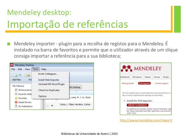 16. 16. Bibliotecas da Universidade de Aveiro | 2013 Mendeley desktop: Importação de referências http://www.mendeley.com/import/  Mendeley importer - plugin para a recolha de registos para o Mendeley. É instalado na barra de favoritos e permite que o utilizador através de um clique consiga importar a referência para a sua biblioteca;