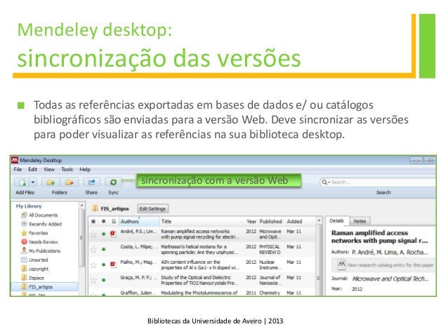 18. 18. Bibliotecas da Universidade de Aveiro | 2013 Mendeley desktop: sincronização das versões  Todas as referências exportadas em bases de dados e/ ou catálogos bibliográficos são enviadas para a versão Web. Deve sincronizar as versões para poder visualizar as referências na sua biblioteca desktop. sincronização com a versão Web