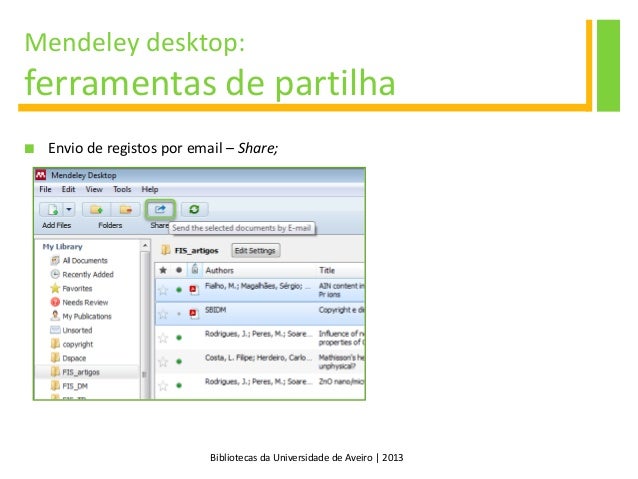 21. 21. Bibliotecas da Universidade de Aveiro | 2013 Mendeley desktop: ferramentas de partilha  Envio de registos por email – Share;