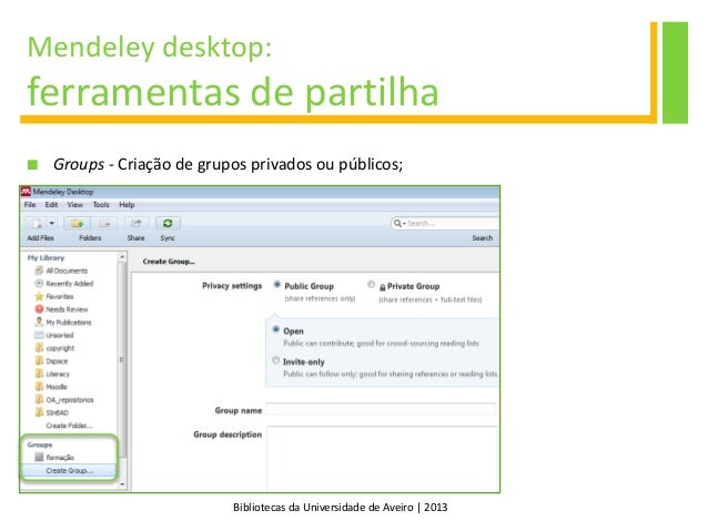 22. 22. Bibliotecas da Universidade de Aveiro | 2013 Mendeley desktop: ferramentas de partilha  Groups - Criação de grupos privados ou públicos;
