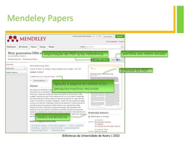 26. 26. Bibliotecas da Universidade de Aveiro | 2013 Mendeley Papers preview do PDF ligação à página do editor e/ou pesquisa noutros recursos dados estatísticos partilha nas redes sociaisexportação do PDF e/ou referência