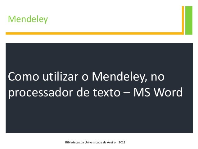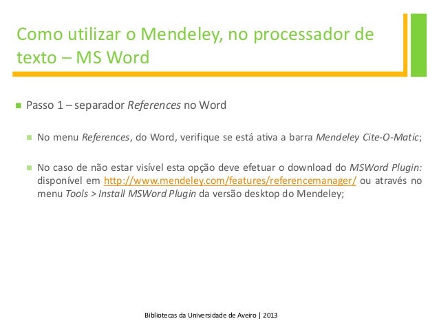 28. 28. Bibliotecas da Universidade de Aveiro | 2013 Como utilizar o Mendeley, no processador de texto – MS Word  Passo 1 – separador References no Word  No menu References, do Word, verifique se está ativa a barra Mendeley Cite-O-Matic;  No caso de não estar visível esta opção deve efetuar o download do MSWord Plugin: disponível em http://www.mendeley.com/features/referencemanager/ ou através no menu Tools > Install MSWord Plugin da versão desktop do Mendeley;