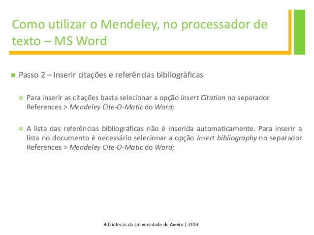 29. 29. Bibliotecas da Universidade de Aveiro | 2013 Como utilizar o Mendeley, no processador de texto – MS Word  Passo 2 – Inserir citações e referências bibliográficas  Para inserir as citações basta selecionar a opção Insert Citation no separador References > Mendeley Cite-O-Matic do Word;  A lista das referências bibliográficas não é inserida automaticamente. Para inserir a lista no documento é necessário selecionar a opção Insert bibliography no separador References > Mendeley Cite-O-Matic do Word;