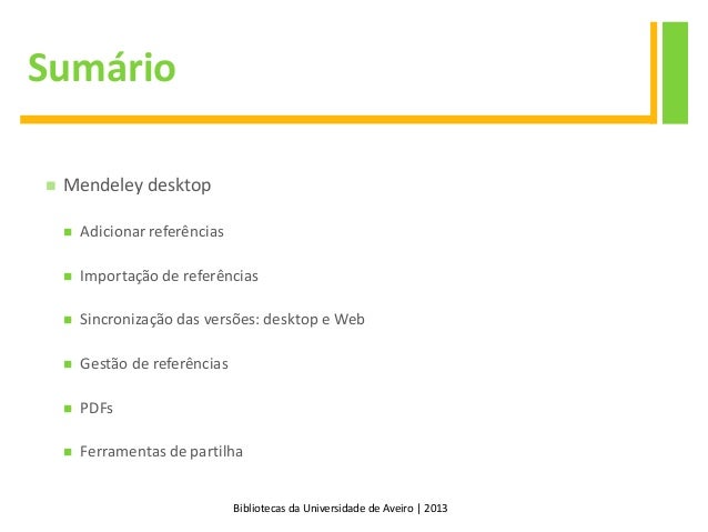 3. 3. Bibliotecas da Universidade de Aveiro | 2013 Sumário  Mendeley desktop  Adicionar referências  Importação de referências  Sincronização das versões: desktop e Web  Gestão de referências  PDFs  Ferramentas de partilha