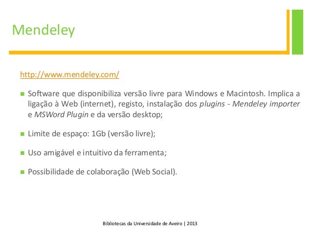 5. 5. Bibliotecas da Universidade de Aveiro | 2013 Mendeley http://www.mendeley.com/  Software que disponibiliza versão livre para Windows e Macintosh. Implica a ligação à Web (internet), registo, instalação dos plugins - Mendeley importer e MSWord Plugin e da versão desktop;  Limite de espaço: 1Gb (versão livre);  Uso amigável e intuitivo da ferramenta;  Possibilidade de colaboração (Web Social).