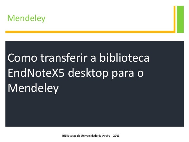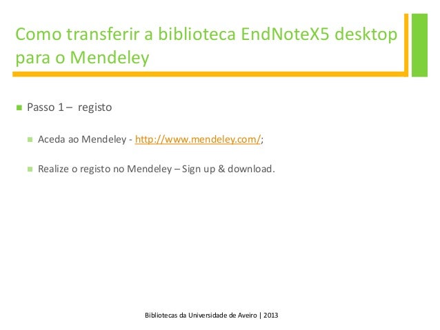 6. 6. Bibliotecas da Universidade de Aveiro | 2013 Mendeley Como transferir a biblioteca EndNoteX5 desktop para o Mendeley