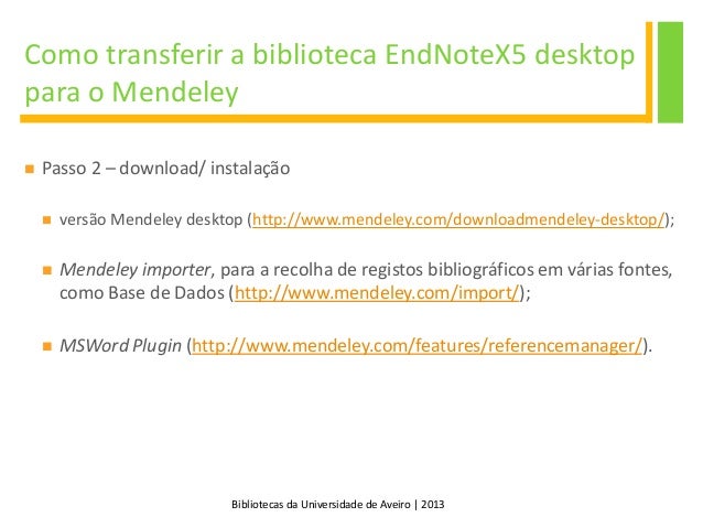 8. 8. Bibliotecas da Universidade de Aveiro | 2013 Como transferir a biblioteca EndNoteX5 desktop para o Mendeley  Passo 2 – download/ instalação  versão Mendeley desktop (http://www.mendeley.com/downloadmendeley-desktop/);  Mendeley importer, para a recolha de registos bibliográficos em várias fontes, como Base de Dados (http://www.mendeley.com/import/);  MSWord Plugin (http://www.mendeley.com/features/referencemanager/).