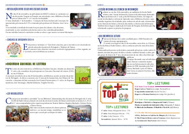 2. 2. Boletim Informativo das Bibliotecas Escolares do Agrupamento de Escolas Dr. Júlio Martins novembro 2013 > Articulação entre ciclos nas escolas do AEJM N o dia 29 de novembro, no polivalente da EBSCT, realizou-se a primeira sessão do projeto Viagens ao Passado, em articulação com a Biblioteca Escolar para os alunos dos 3.º e 4.º ano de escolaridade. O tema abordado 1.º de dezembro – Coroação de Nossa Senhora da Conceição, foi apresentado pela turma do 9.ºD e orientado pelo professor de História, Luís Carvalho. A recetividade à atividade foi muito boa por parte dos alunos e dos docentes, mostrando-se estes satisfeitos pela forma como se fez a interdisciplinaridade. Foi um trabalho louvável e meritório a todos os níveis e que merece as nossas felicitações. novembro 2013 Boletim Informativo das Bibliotecas Escolares do Agrupamento de Escolas Dr. Júlio Martins > Sessão Informal de Literacia da Informação R ealizou-se, no dia 19 de novembro, no auditório da Escola Nadir Afonso, uma Sessão Informal de Literacia da Informação destinada aos professores de 1º ciclo, pela PB Filomena Freitas. Ao longo da sessão foi abordado o referencial Aprender com a Biblioteca Escolar e apresentadas sugestões de atividades, para realizar em sala de aula, relacionadas com a literacia de leitura, a literacia dos média e a literacia da informação. Também houve lugar à exploração do Guião de Pesquisa da Informação Big 6 destinado a apoiar os projetos de pesquisa. > XXII Encontro de Leitura > Concurso de ortografia 2013-14 E stá prestes a terminar a 1.ª fase deste concurso, que se encontra a ser executada em sala de aula pelos docentes de Português e Titulares de Turma. O concurso está a decorrer em várias escolas do Agrupamento e a fase seguinte, no 2.º período, será nas bibliotecas escolares. >Concurso Nacional de Leitura T al como em anos anteriores, as Bibliotecas Escolares lançam o desafio aos alunos do 3º ciclo e do secundário de participarem no Concurso Nacional de Leitura (CNL), na sua 8ª Edição. A inscrição está aberta até ao dia 20 de dezembro, na biblioteca escolar ou junto do professor de Português. As obras a concurso são: O meu pé de laranja lima, José Mauro de Vasconcelos e Aventuras de João sem medo, José Gomes Ferreira para o 3.º ciclo e As Pequenas memórias, José Saramago e Manhã Submersa, Vergílio Ferreira. V inícius de Moraes foi o autor escolhido para o XXII Encontro de Leitura do nosso agrupamento. O evento teve lugar no dia 22 de novembro, sexta-feira, às 21 horas, na Escola Básica Nadir Afonso, e deu a conhecer parte da vasta obra deste escritor. Começando pela poesia e pela música, passando pela prosa e pelos textos de opinião, de tudo um pouco foi lido e ouvido e também ficamos a saber, por um grupo de alunos do 5º ano, um pouco mais da sua vida e das obras que publicou. O espaço decorado com as borboletas azuis, brancas e amarelas inspiradas no seu belo poema foi obra dos alunos de NEE, apoiados pela Prof.ª Teresa Machado e pela AO Maria José Costa, no projeto Um livro, diferentes leituras. TOP+ LEITURAS E.B. Santa Cruz Trindade: Rupert salva o Natal (texto adapt. Por QuidNovi) O espantalho enamorado (Guido Visconti ) > Ler na biblioteca Rupert e a Menina-Estrela (texto adapt. Por QuidNovi) C omeçou em novembro a atividade “Ler na Biblioteca”, dinamizada pelos docentes de Português do 2º ciclo. Na BE da Nadir Afonso, durante este mês decorreram 4 sessões de leitura envolvendo as turmas A, C, D e G do 5.º ano acompanhadas pelas respetivas professoras: Beatriz Martins, Eugénia Machado, Cristina Freitas e Glória Pessoa. Mais uma excelente maneira de alterar práticas, motivar e, ao mesmo tempo, rentabilizar os recursos que a escola põe ao dispor de todos. -2- TOP+ LEITORES 1º ciclo: Diana Margarida Alves - 3ºA 2º ciclo: Ema Marques Morais – 5ºA 3º ciclo: Lídia Teixeira – 8ºA Secundário: Samuel Silva – 10ºD E.B. Nadir Afonso: Henrique, o Terrível e a Surpresa de Natal (F. Simon) Maria, os segredos da irmã mais velha, (Margarida F. Santos) O Diário de um Banana: O Rodrick é Terrível (Jeff Kinney) E.S. Dr.Júlio Martins: APercy Jackson e os ladrões do Olímpio (Rick Riordan) O Meu Primeiro Beijo e outros Traumas (Adam Bagdasarian) As Aventuras de Tom Sawyer (Mark Twain) -3-