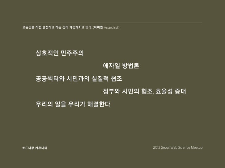 16. 16. 모든것을 직접 결정하고 하는 것이 가능해지고 있다. (어쩌면 Anarchist) 상호적인 민주주의 애자일 방법론 공공섹터와 시민과의 실질적 협조 정부와 시민의 협조, 효율성 증대 우리의 일을 우리가 해결한다코드나무 커뮤니티 2012 Seoul Web Science Meetup
