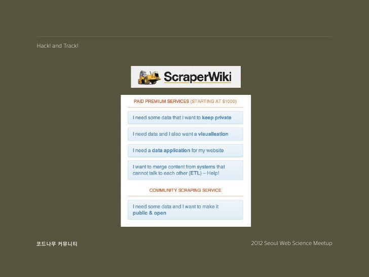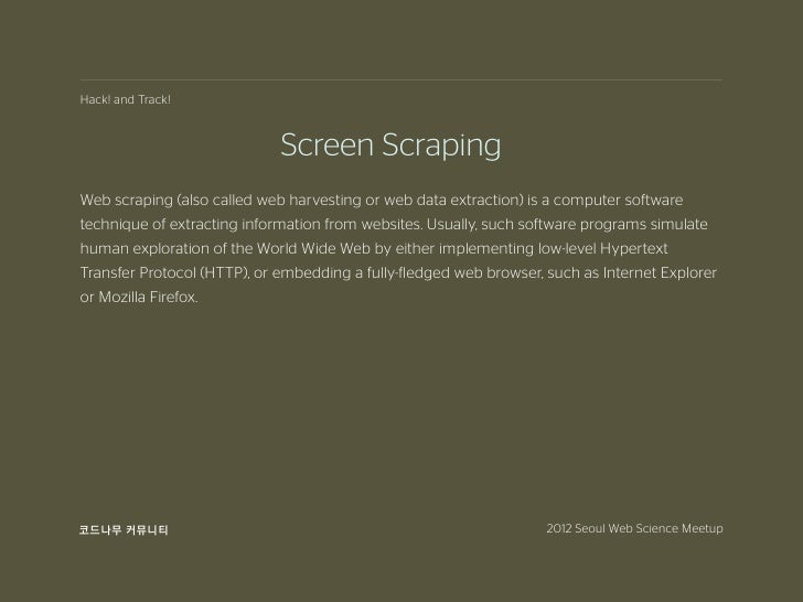 19. 19. Hack! and Track! Screen ScrapingWeb scraping (also called web harvesting or web data extraction) is a computer softwaretechnique of extracting information from websites. Usually, such software programs simulatehuman exploration of the World Wide Web by either implementing low-level HypertextTransfer Protocol (HTTP), or embedding a fully-fledged web browser, such as Internet Exploreror Mozilla Firefox.코드나무 커뮤니티 2012 Seoul Web Science Meetup