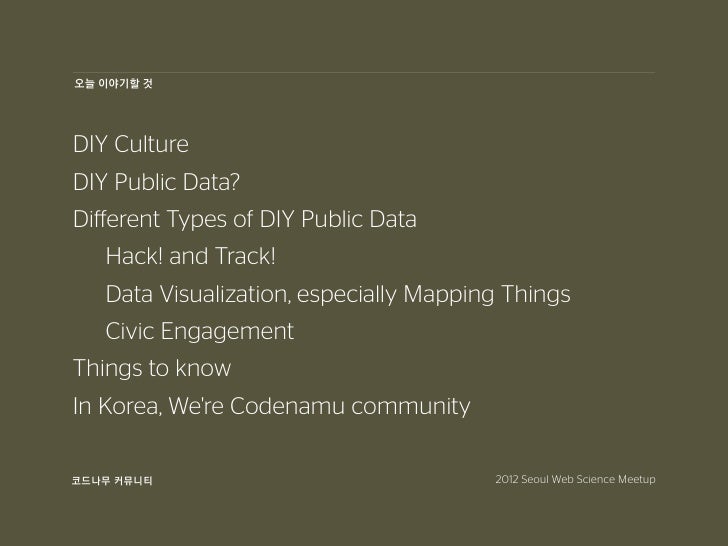 2. 2. 오늘 이야기할 것DIY CultureDIY Public Data?Different Types of DIY Public Data Hack! and Track! Data Visualization, especially Mapping Things Civic EngagementThings to knowIn Korea, Were Codenamu community코드나무 커뮤니티 2012 Seoul Web Science Meetup