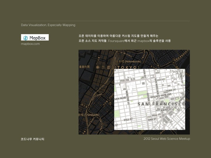 26. 26. Data Visualization, Especially Mapping 오픈 데이터를 이용하여 아름다운 커스텀 지도를 만들게 해주는 오픈 소스 지도 저작툴. Foursquare에서 최근 mapbox의 솔루션을 사용mapbox.com코드나무 커뮤니티 2012 Seoul Web Science Meetup