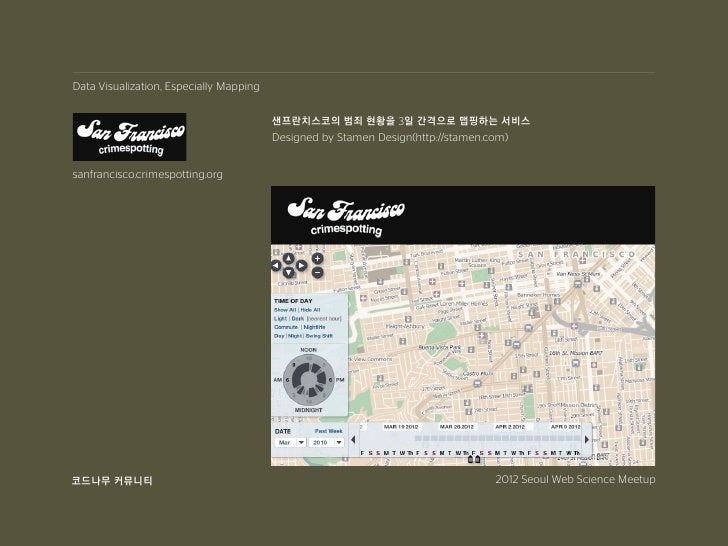 27. 27. Data Visualization, Especially Mapping 샌프란치스코의 범죄 현황을 3일 간격으로 맵핑하는 서비스 Designed by Stamen Design(http://stamen.com)sanfrancisco.crimespotting.org코드나무 커뮤니티 2012 Seoul Web Science Meetup