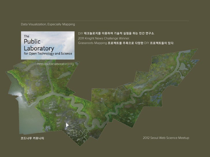 28. 28. Data Visualization, Especially Mapping DIY 테크놀로지를 이용하여 기술적 실험을 하는 민간 연구소. 2011 Knight News Challenge Winner. Grassroots Mapping 프로젝트를 주축으로 다양한 DIY 프로젝트들이 있다. http://publiclaboratory.org코드나무 커뮤니티 2012 Seoul Web Science Meetup