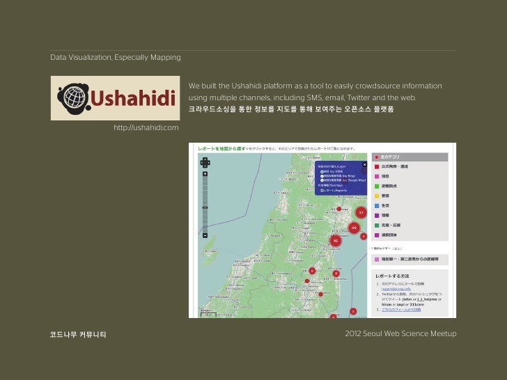 29. 29. Data Visualization, Especially Mapping We built the Ushahidi platform as a tool to easily crowdsource information using multiple channels, including SMS, email, Twitter and the web. 크라우드소싱을 통한 정보를 지도를 통해 보여주는 오픈소스 플랫폼 http://ushahidi.com코드나무 커뮤니티 2012 Seoul Web Science Meetup