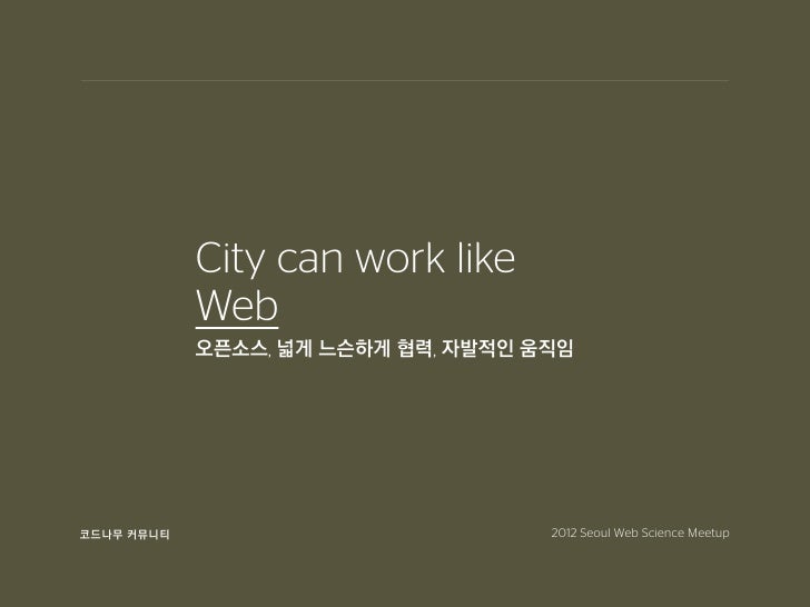 3. 3. City can work like Web 오픈소스, 넓게 느슨하게 협력, 자발적인 움직임코드나무 커뮤니티 2012 Seoul Web Science Meetup